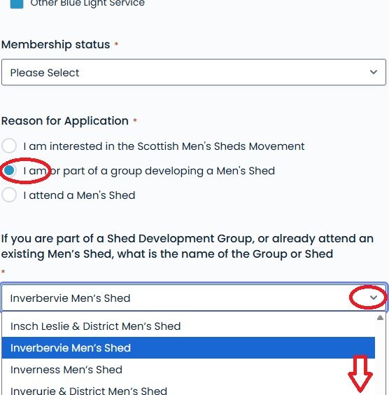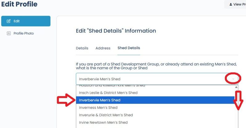 Select the middle option as we're still in the development phase, click the little arrow on the right, and scroll down to find Inverbervie Men's Shed.